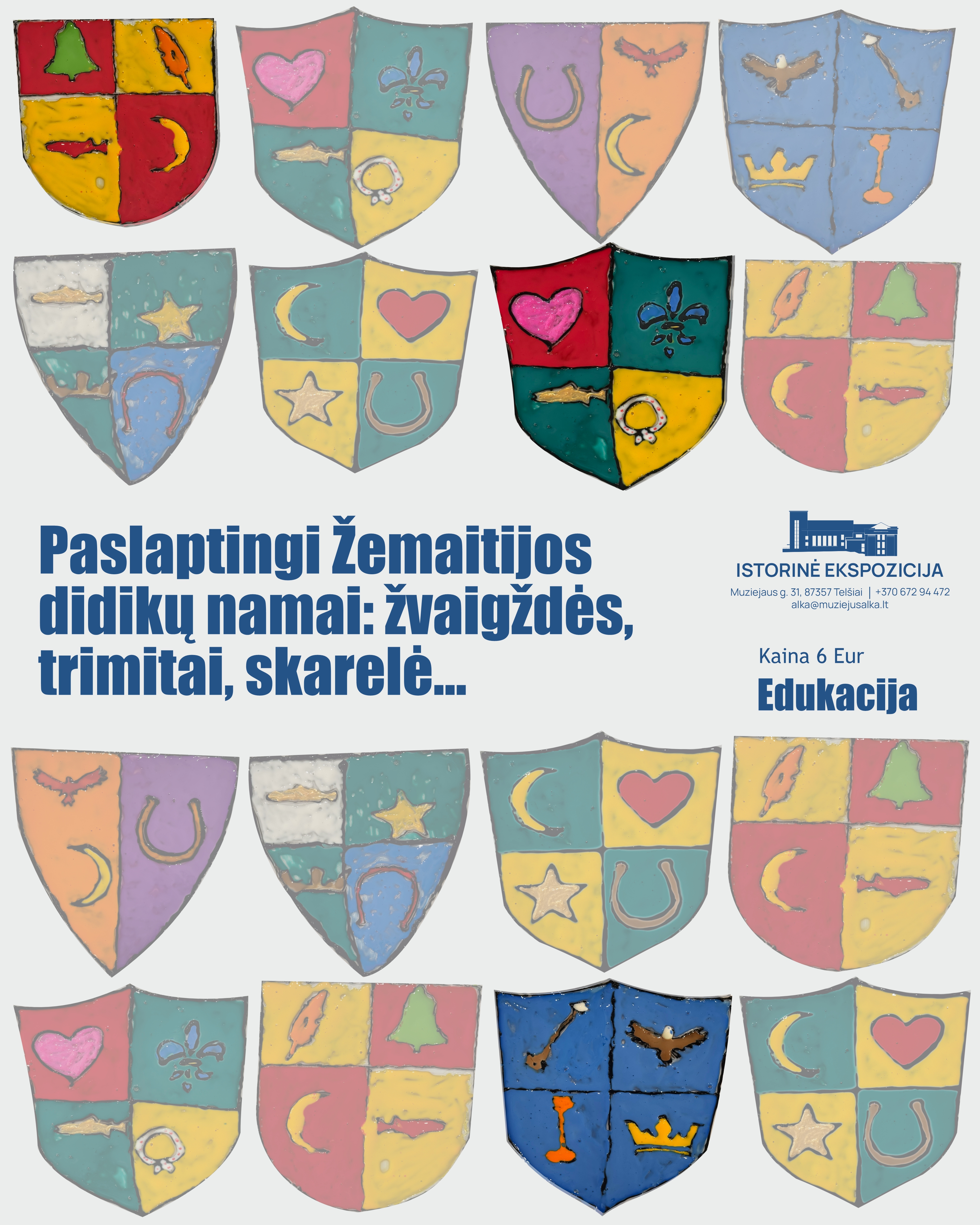 Žemaičių muziejaus „Alka“ Dvarų ekspozicijos salėje susipažinsite su žymiausiomis Žemaitijos didikų giminėmis ir jų herbais. Aptarsime heraldikos elementus, jų simboliką ir reikšmę tiek istorijoje, tiek šiandien. Praktinės dalies metu, naudodami spalvotus stiklo dažus bei trafaretus, sukursite savo unikalų giminės herbą ant stiklo.
