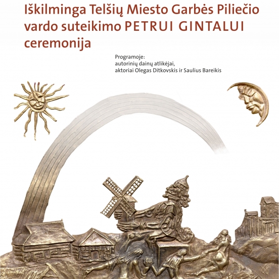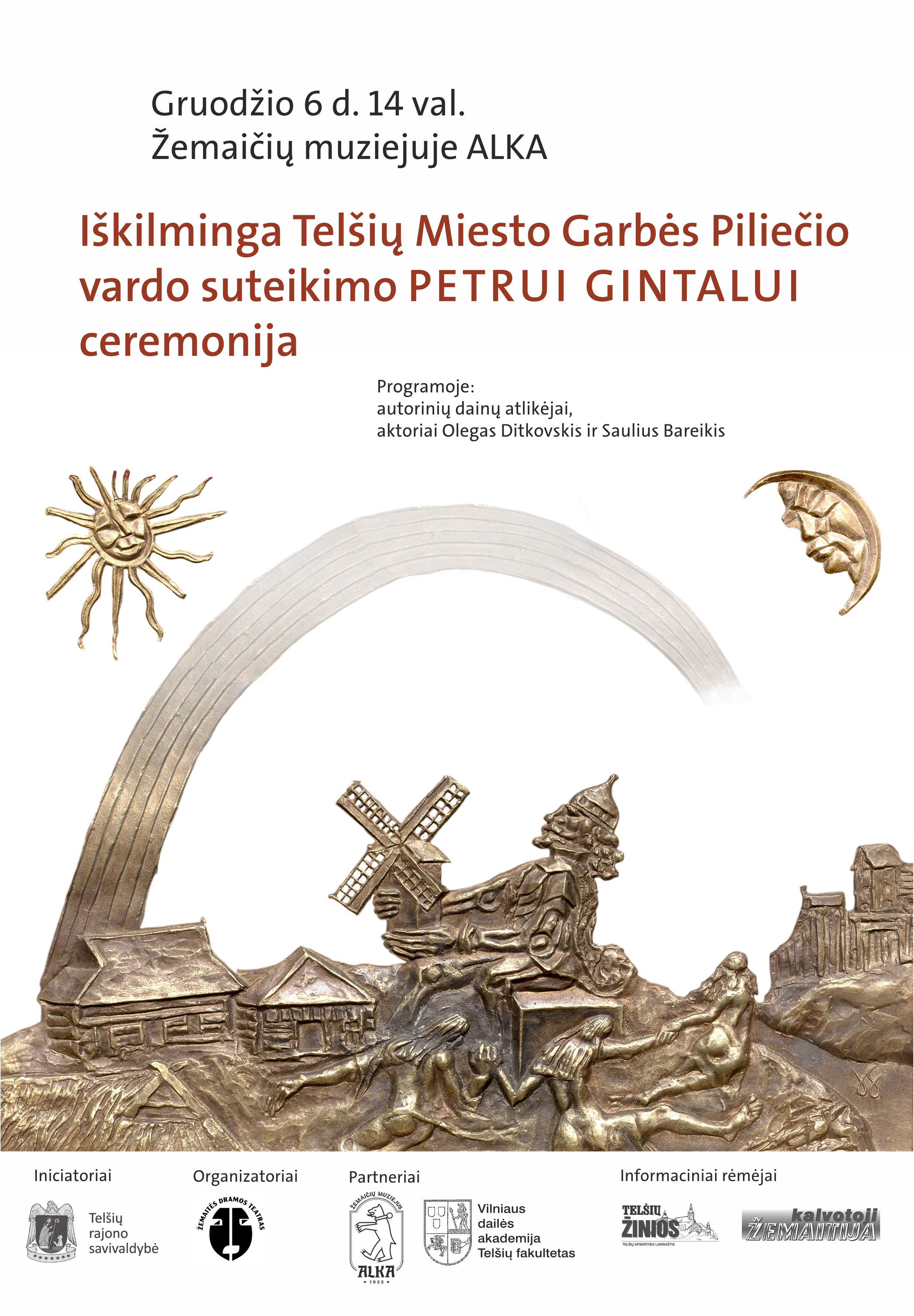 Gruodžio 6 d. 14 val. Žemaičių muziejuje „Alka“ vyks iškilminga Telšių miesto Garbės piliečio vardo suteikimo Petrui Gintalui ceremonija ir parodos „Petras Gintalas: tarp meno ir poezijos“ atidarymas.